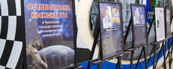 Экспозиция в холле второго этажа главного корпуса рассказывает о летчиках-космонавтах, которые были гостями Уральского государственного экономического университета