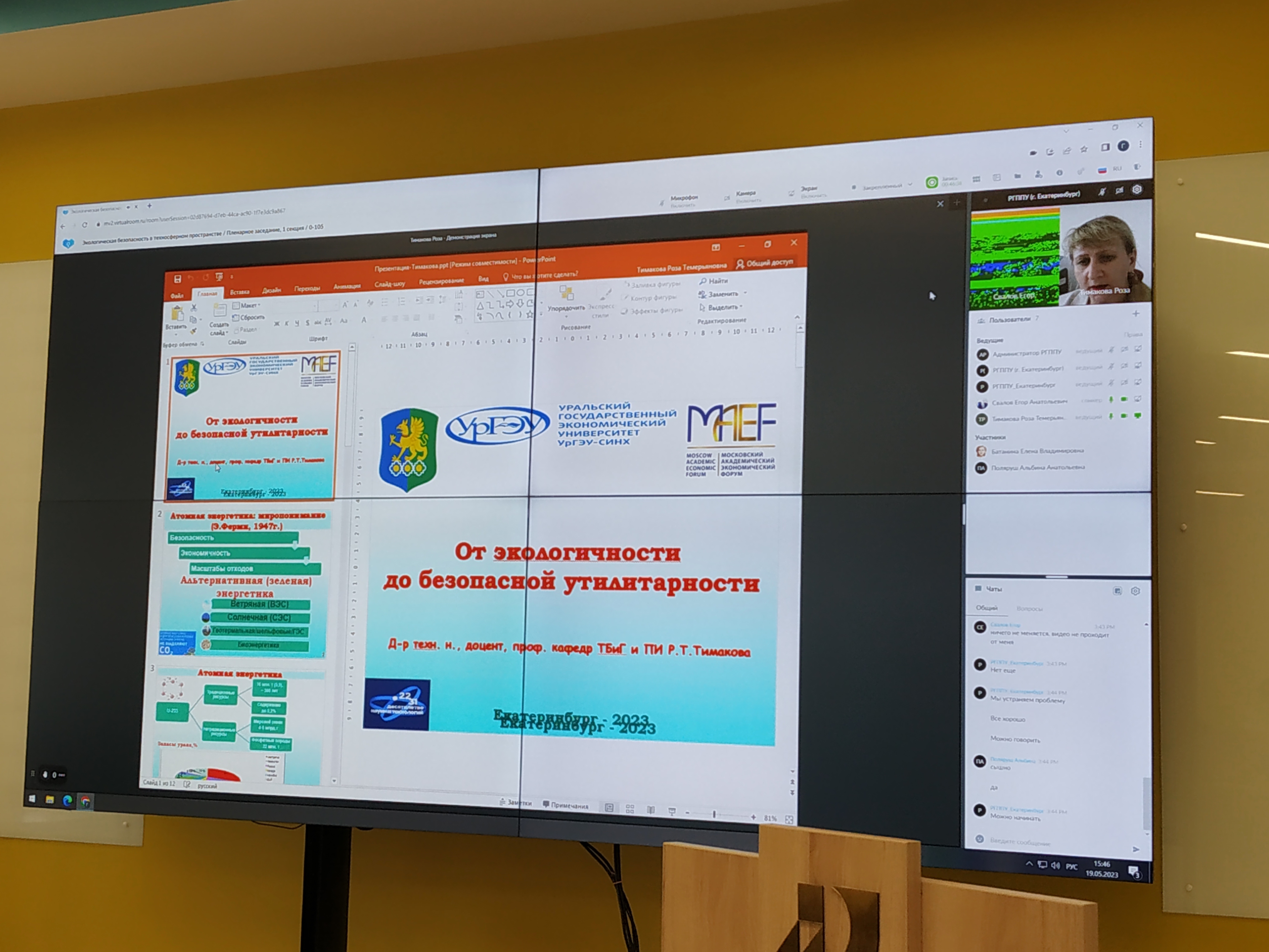 Пленарную сессию открыл доклад Сергея Анахова, посвященный аспектам безопасности электроплазменных технологий. Д-р техн. наук, профессор кафедр пищевой инженерии, туристического бизнеса и гостеприимства и логистики и коммерции УрГЭУ Роза Тимакова представила доклад «От экологичности до безопасной утилитарности», в котором рассмотрела вопросы атомной энергетики и альтернативных (зеленых) источников энергии.