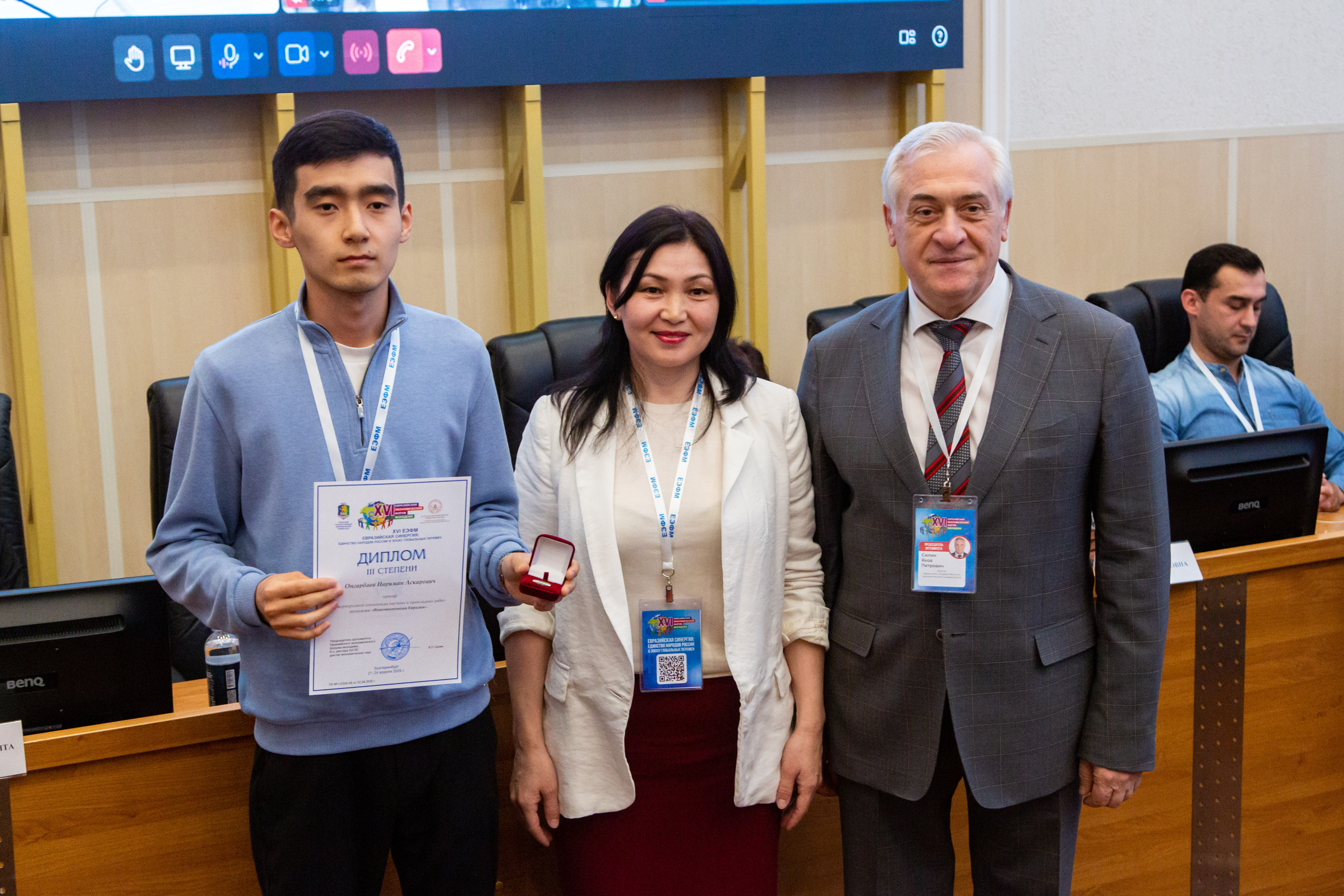 Победителей площадок чествовали в Екатеринбурге. Лучшие из лучших получили дипломы и почетные знаки «Звезда Евразии». Так, почетным знаком отмечен студент 4 курса Евразийского национального университета имени Л. Н. Гумилева (Казахстан) Нариман Онгарбаев, который представил научную работу на тему глобальных экологических проблем Аральского моря: «Я родом из Кызылординской области — она расположена рядом с Аральским морем, на юге Казахстана. Это самый засушливый регион страны, где каждый десятый житель страдает от онкологических заболеваний. Эта серьезная проблема и побудила меня представить свою научную работу на международном уровне: я хотел предложить идеи по ее решению. Я доволен достигнутым результатом. После окончания университета планирую вернуться в родной регион. Моя цель — содействовать улучшению инфраструктуры реки Сырдарья, которая ранее впадала в Аральское море, и способствовать повышению уровня воды в нем».