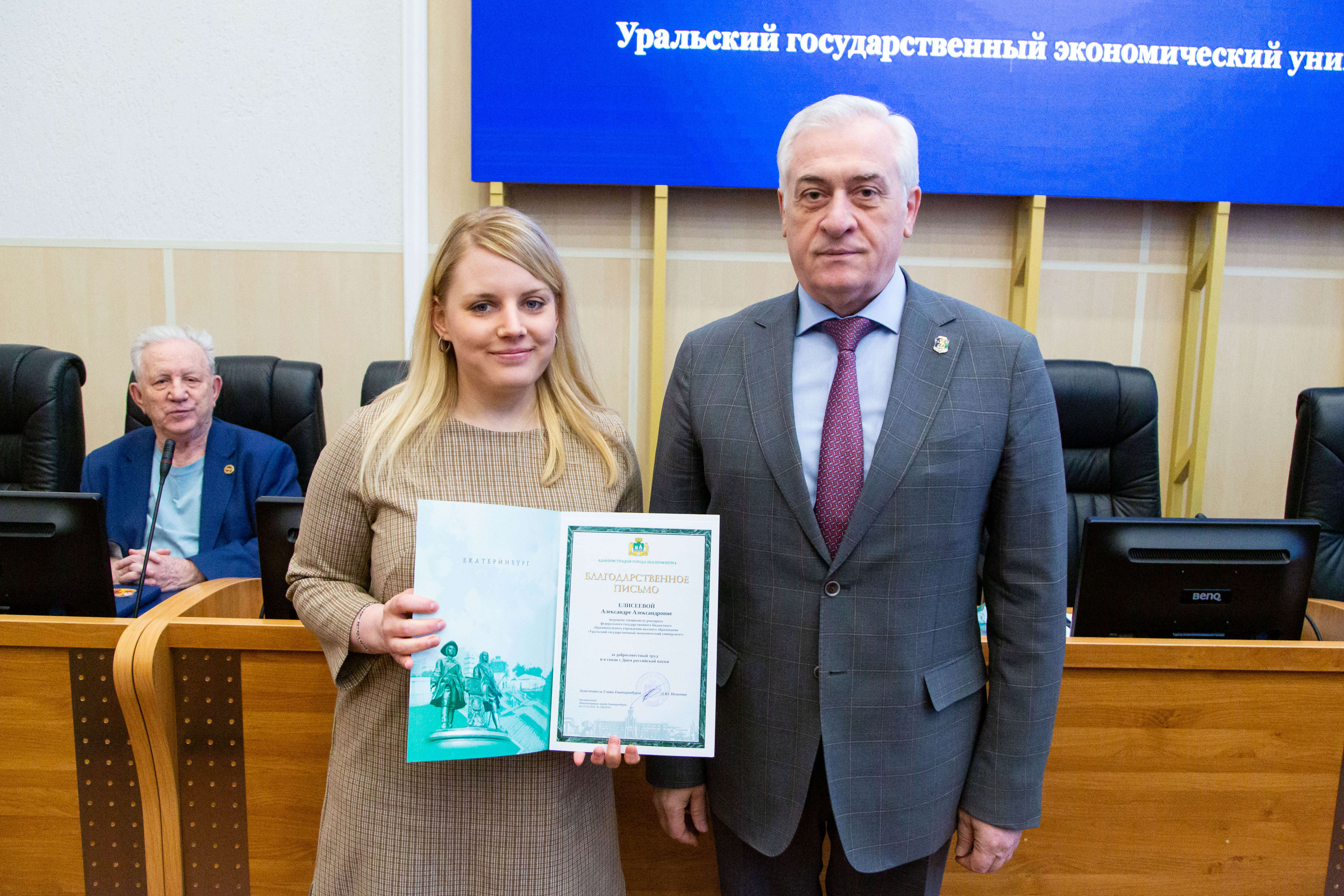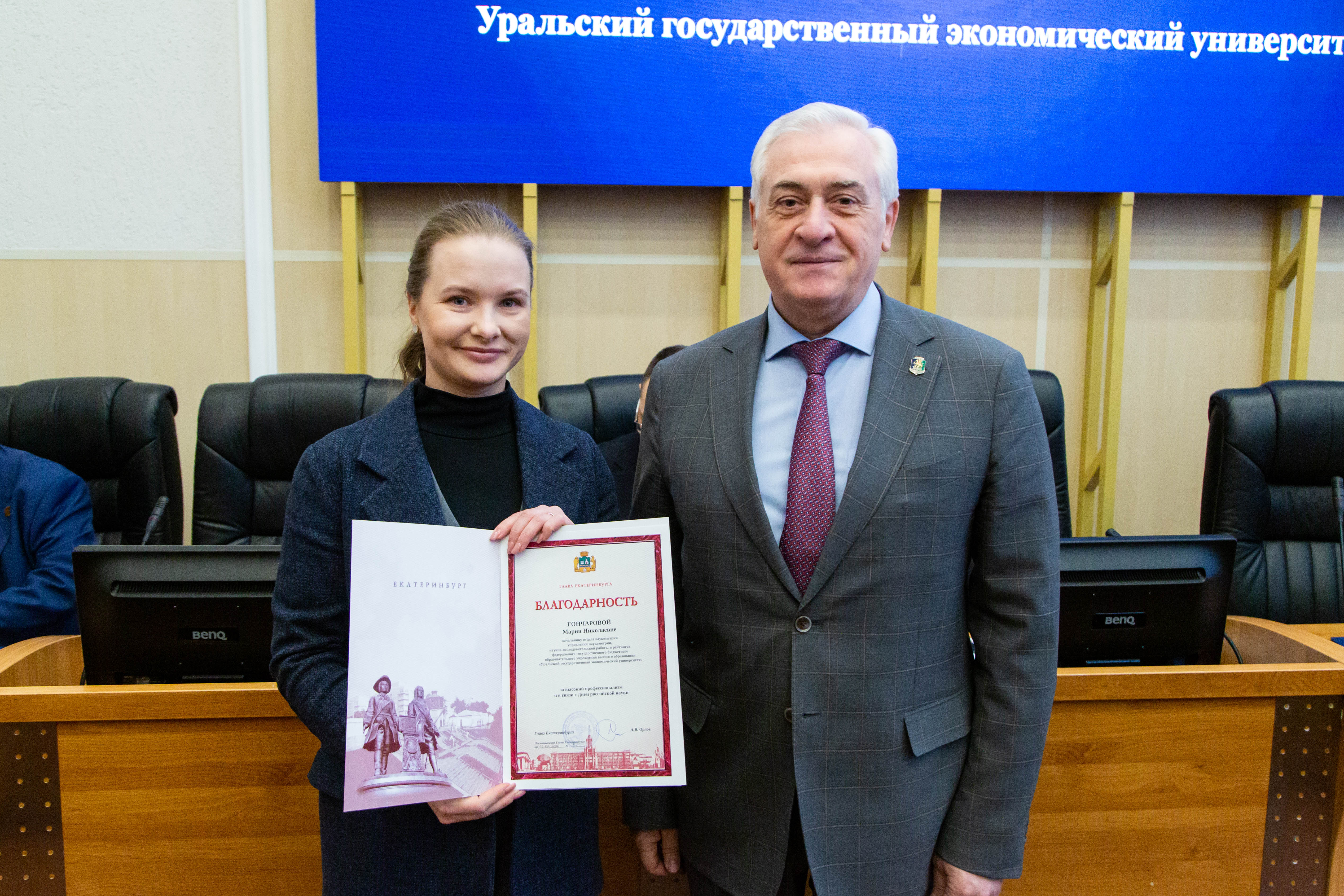 Благодарственные письма администрации города Екатеринбурга за добросовестный труд и в связи с Днем российской науки вручены ведущему специалисту ректората УрГЭУ Александре Елисеевой, преподавателю Колледжа УрГЭУ Юлии Костаревой.