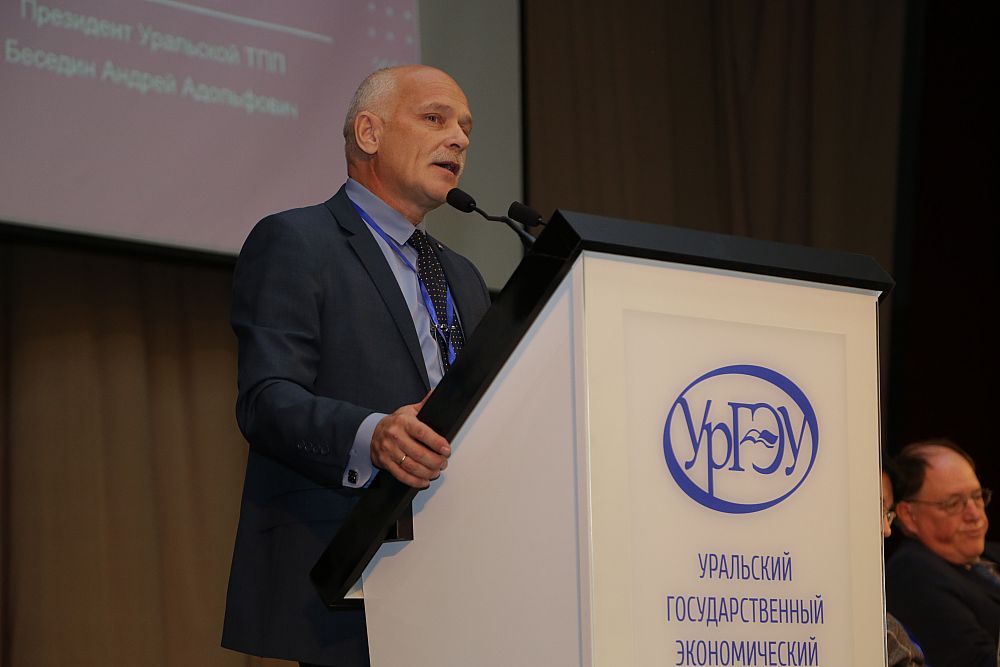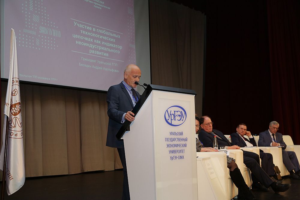 Президент Уральской торгово-промышленной палаты, вице-президент Уральского отделения ВЭО России Андрей Беседин сделал доклад «Участие в глобальных технологических цепочках как индикатор неоиндустриального развития».