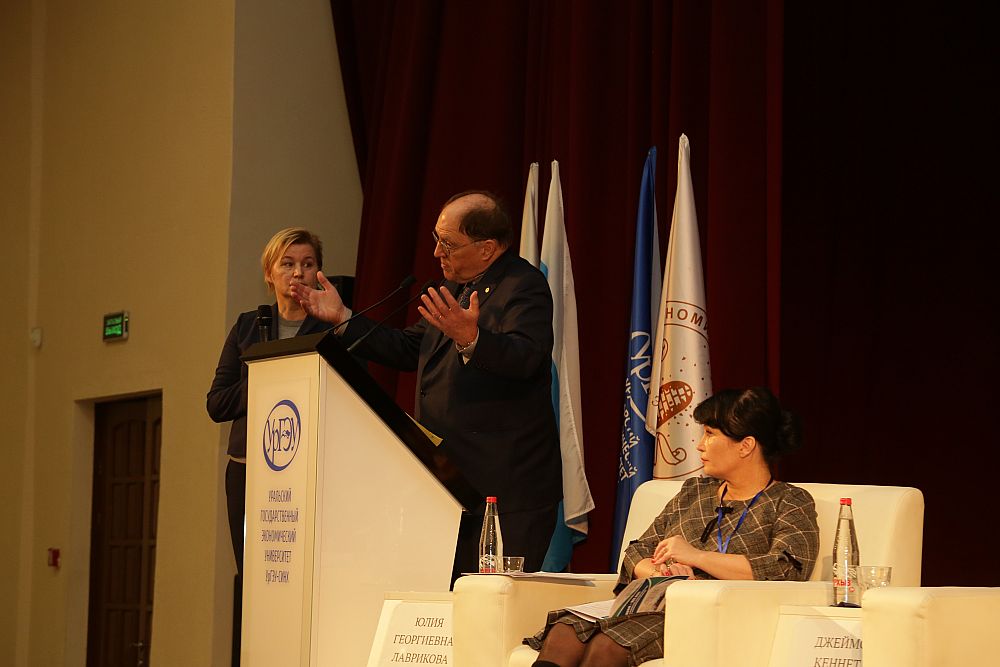 Специально для участия в конференции пригласили многолетнего партнера Вольного экономического общества России известного экономиста США, почетного доктора наук РЭУ им. Г.В. Плеханова, профессора Школы по связям с общественностью им. Линдона Джонсона – подразделения Техасского университета в Остине, председателя американской организации «Объединенные экономисты за сокращение вооружений» (ECAAR), доктора философии Йельского университета Джеймса Кеннета Гэлбрейта.