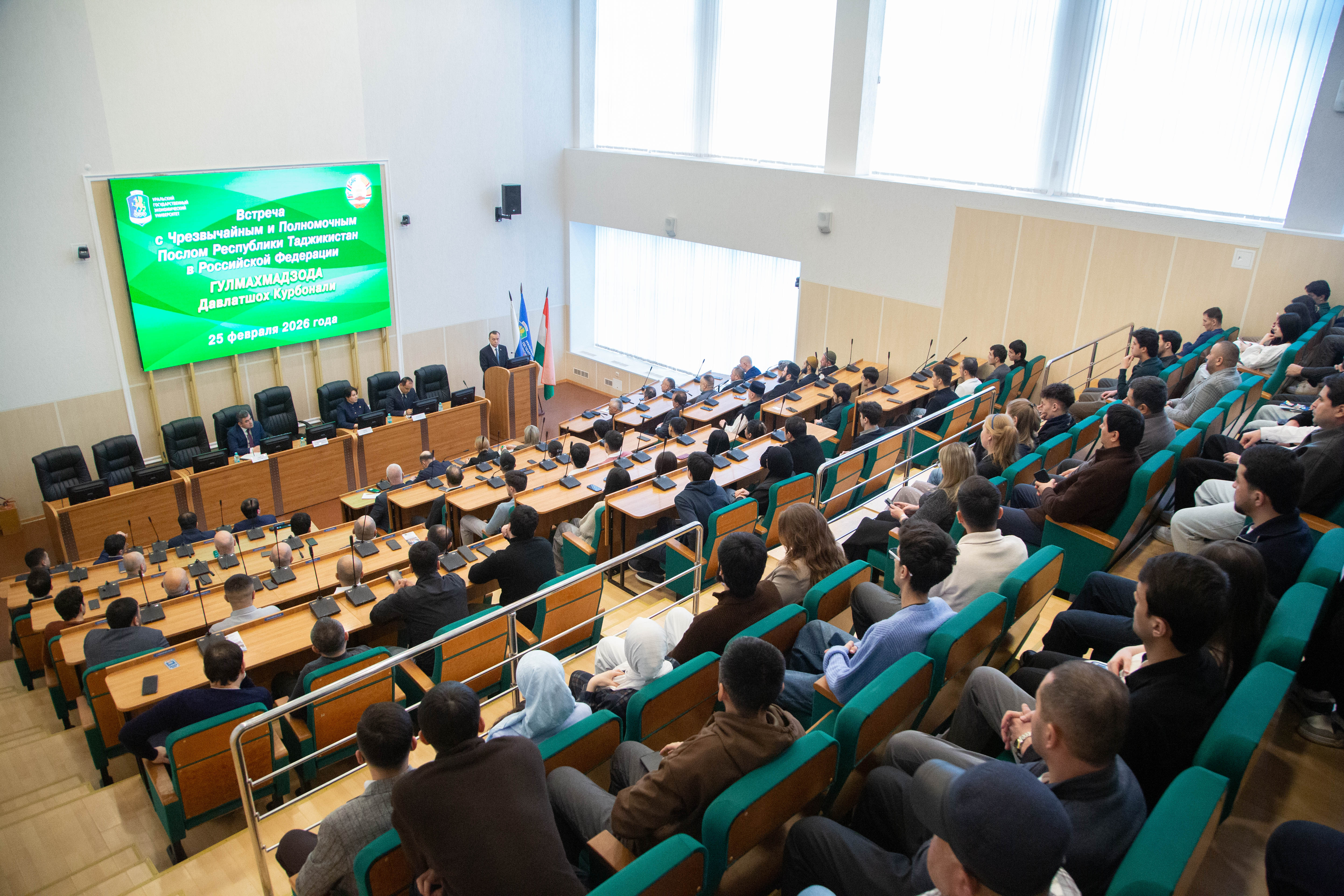 Затем посол встретился со студентами из Таджикистана. В рамках беседы он выслушал мнения и предложения учащихся, а также обсудил с администрацией вуза вопросы поддержки: в частности, возможности содействия в привлечении абитуриентов и актуализации образовательных программ с учетом потребностей современной экономики.