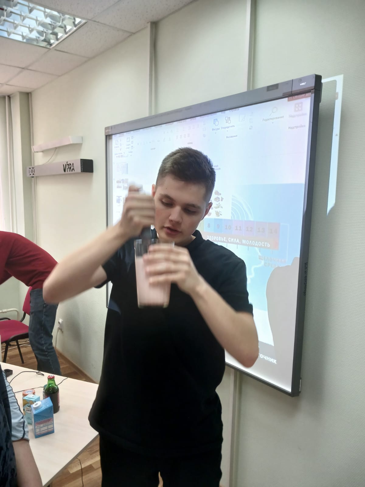 Старший лаборант кафедры биотехнологии и инжиниринга Дарья Порошина показала учащимся колледжа методику создания устойчивых белковых эмульсий на основе эталонного белка альбумина, содержащего все незаменимые аминокислоты. Этот десерт полезен всем, даже тем, кто желает ограничения потребления сахара.