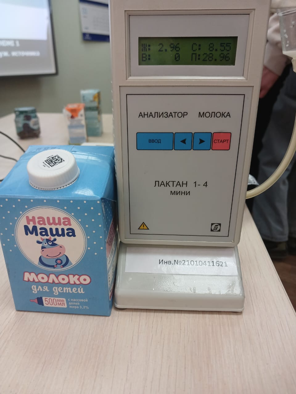 Заведующая лабораторией товароведения и экспертизы Людмила Аврамчук провела экспертизу молока с использованием анализатора качества «Лактан 1-4 М», который позволяет быстро и точно определить различные показатели: массовую долю жира, сухой обезжиренный молочный остаток (СОМО), плотность.