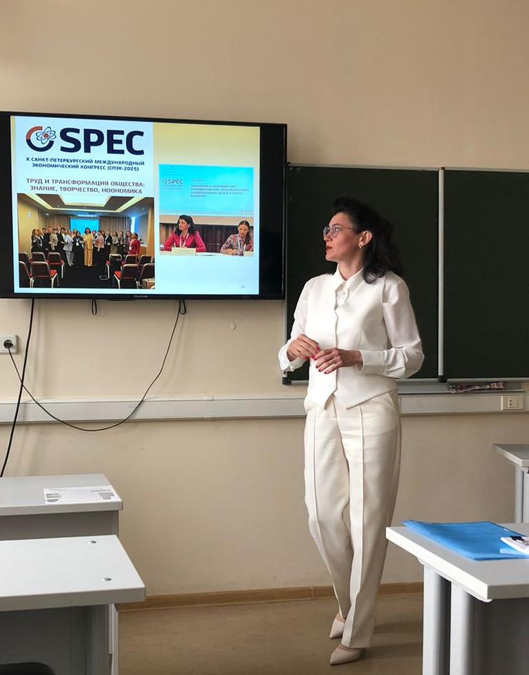 Светлана Пьянкова представила методические и практические подходы преподавания курса ноономики в Уральском государственном экономическом университете. Профессор подчеркнула, что УрГЭУ является организатором уникального и важного Международного конкурса «Теория ноономики как ключ к исследованию социально-экономических трансформаций 21 века», проводимого в рамках Евразийского экономического форума молодежи. В 2025 году в конкурсе приняли участие 110 человек, было представлено 69 конкурсных исследовательских работ, что больше в 2 раза чем в прошлом году. В этом году увеличилось количество вузов, впервые участвовали Тамбов, Вологда, Крым. Также в этом году увеличилось количество международных участников.