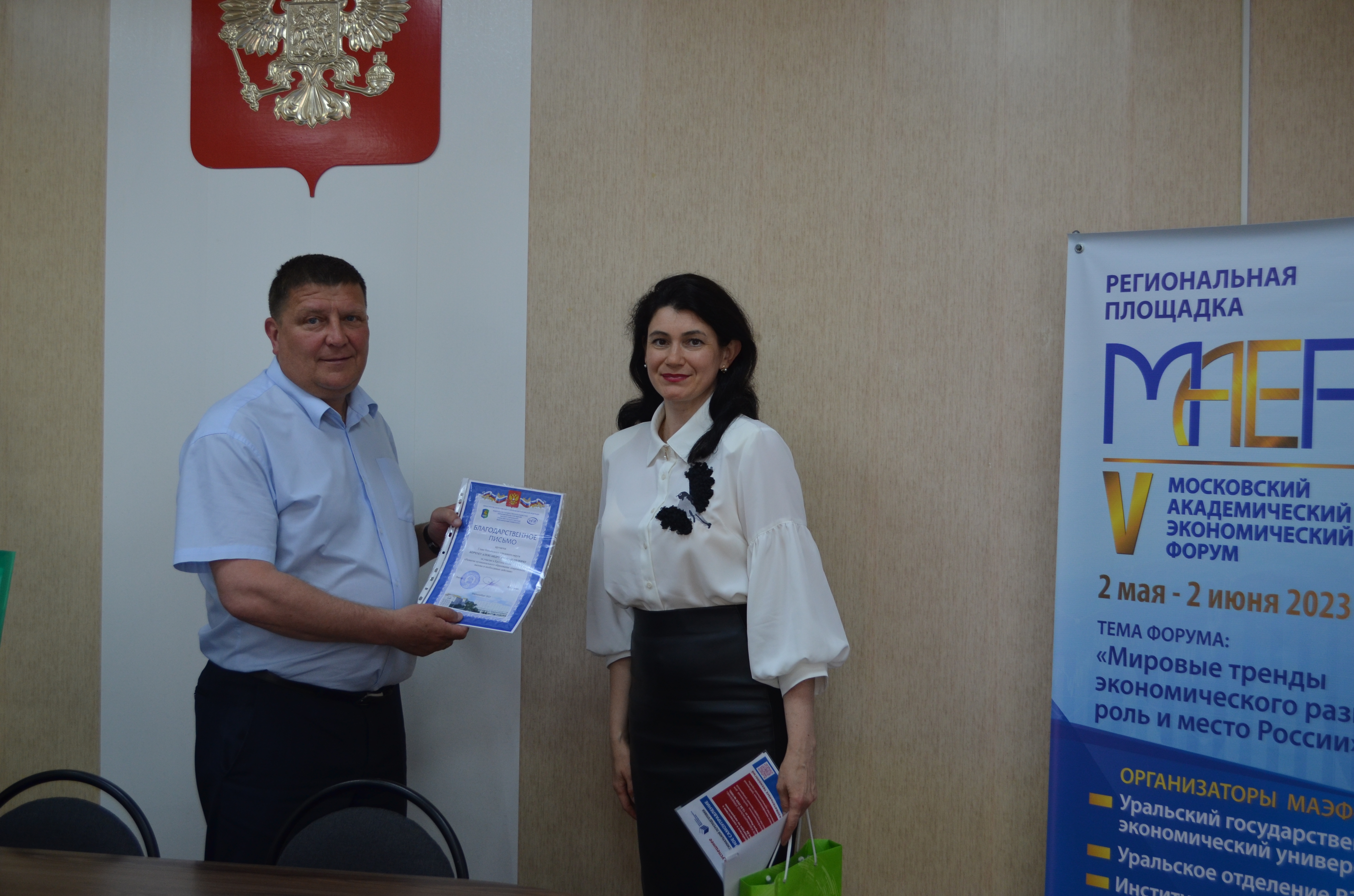 В ознаменование конструктивного и плодотворного сотрудничества с УрГЭУ было передано благодарственное письмо главе Невьянского городского округа Александру Берчуку от ректора университета, вице-президента ВЭО России, президента Уральского отделения ВЭО России, доктора экономических наук, профессора Якова Силина.