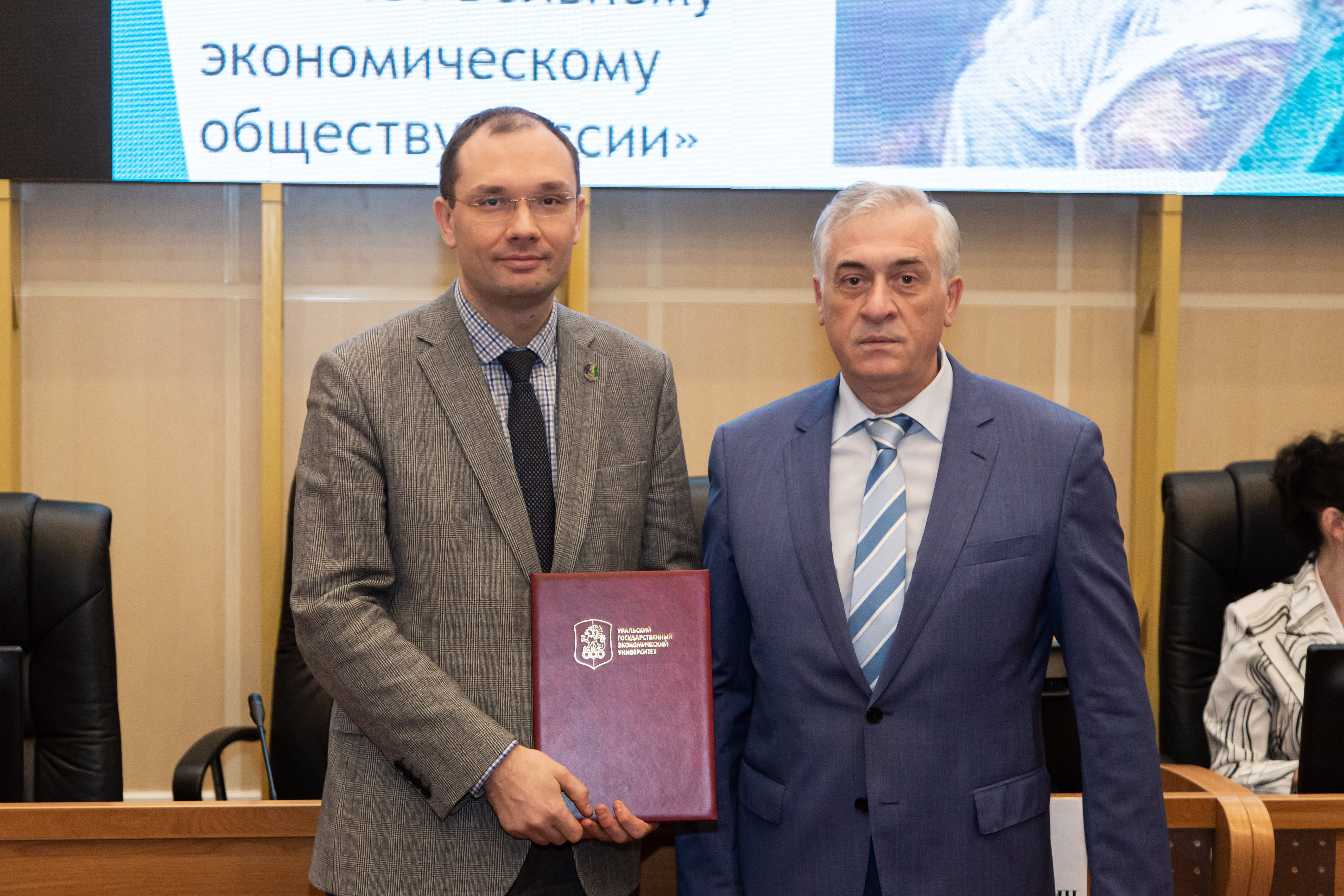 В Уральском государственном экономическом университете состоялась церемония вручения благодарственных писем сотрудникам и партнерам УрГЭУ от Вольного экономического общества России, старейшей и одной из самых крупных организаций на сегодняшний день – в этом году ей исполнилось 256 лет. Награждение по итогам года стало ключевой традицией Уральского отделения ВЭО.