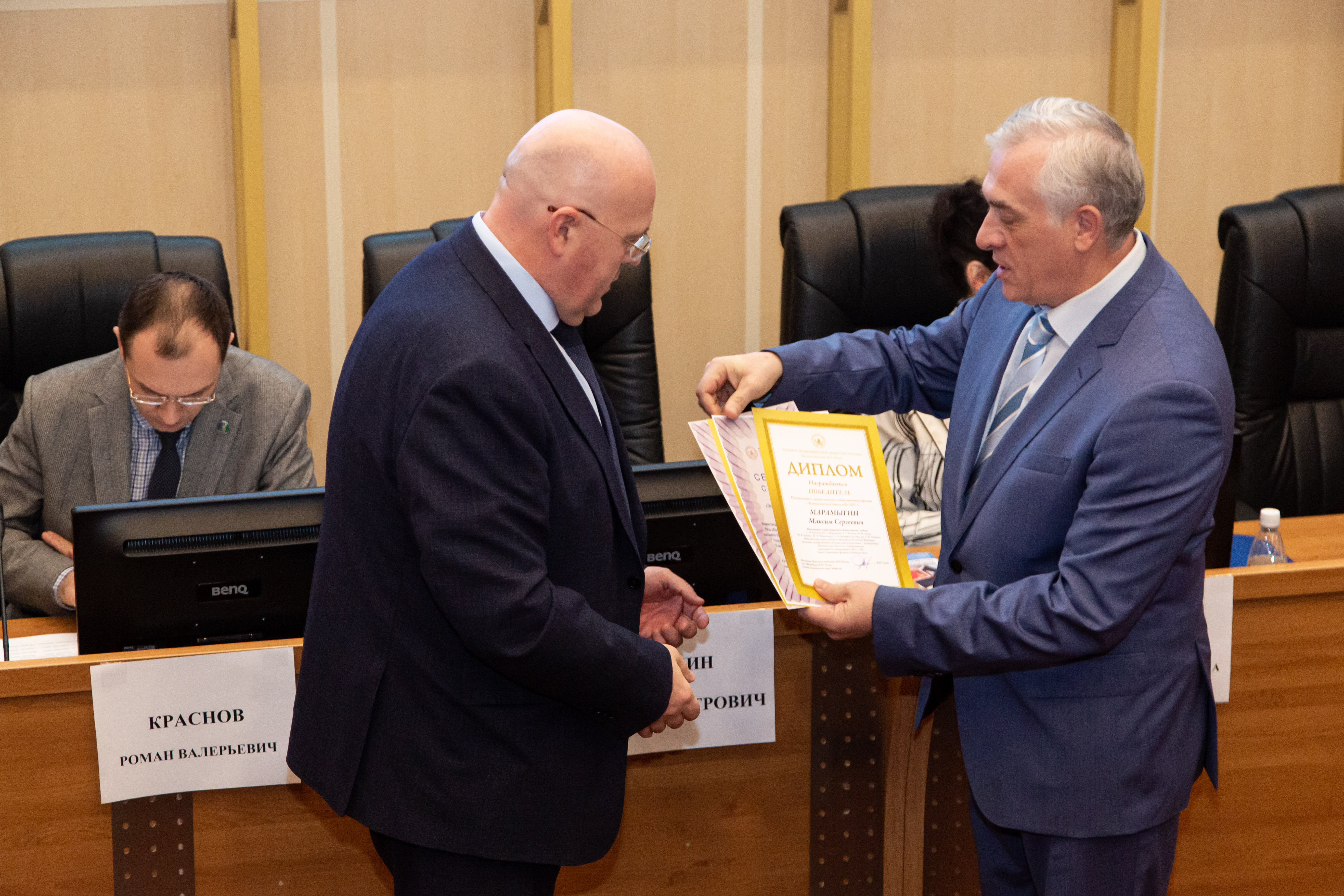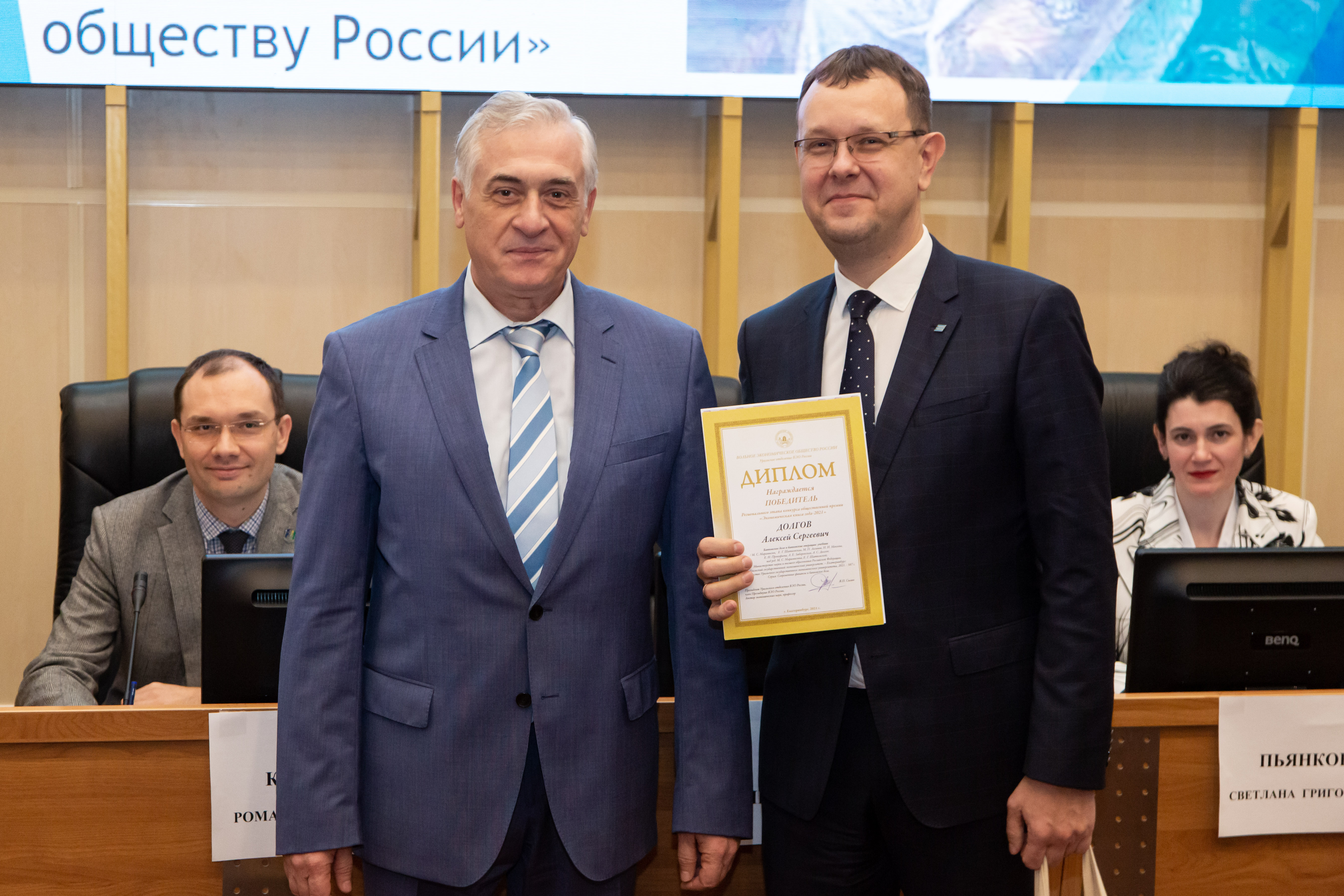 Вручая благодарственные письма Вольного экономического общества России и благодарственные письма Уральского отделения Вольного экономического общества России за креативность подхода в организации Общероссийской образовательной акции «Всероссийский экономический диктант – 2021», а также благодарственные письма за высокопрофессиональную организацию и проведение III Уральского экономического форума «Урал – драйвер неоиндустриального и инновационного развития России», президент Уральского отделения ВЭО России Яков Силин особо отметил работу по организации, проведению и освещению в СМИ этих мероприятий проректора по социальной работе УрГЭУ, кандидата филологических наук Романа Краснова.