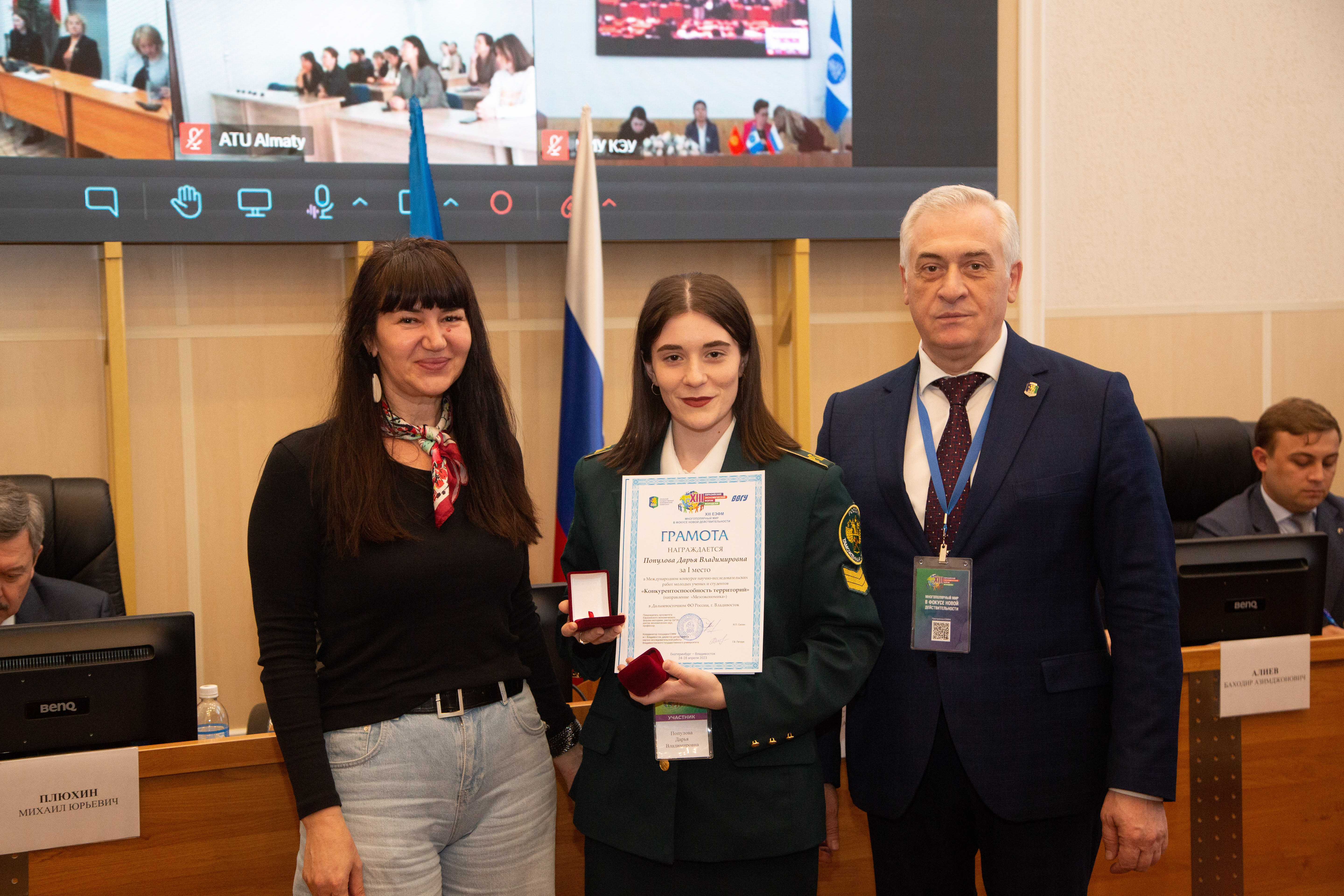 Среди студентов с Дальнего Востока грамотой за I место в региональном туре и дипломом за II место в Международном конкурсе научно-исследовательских работ молодых ученых и студентов «Конкурентоспособность территорий» награждена Дарья Популова.