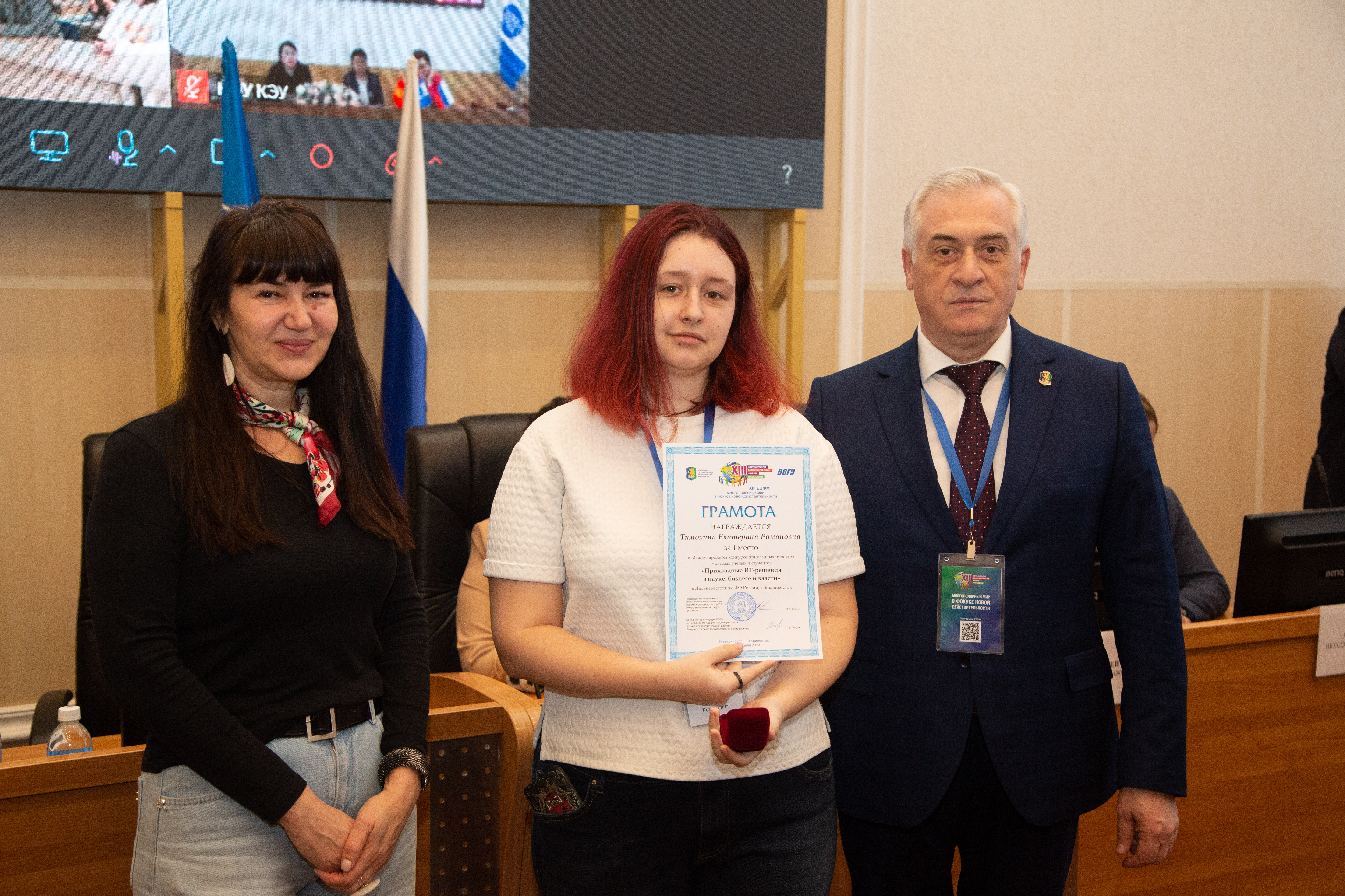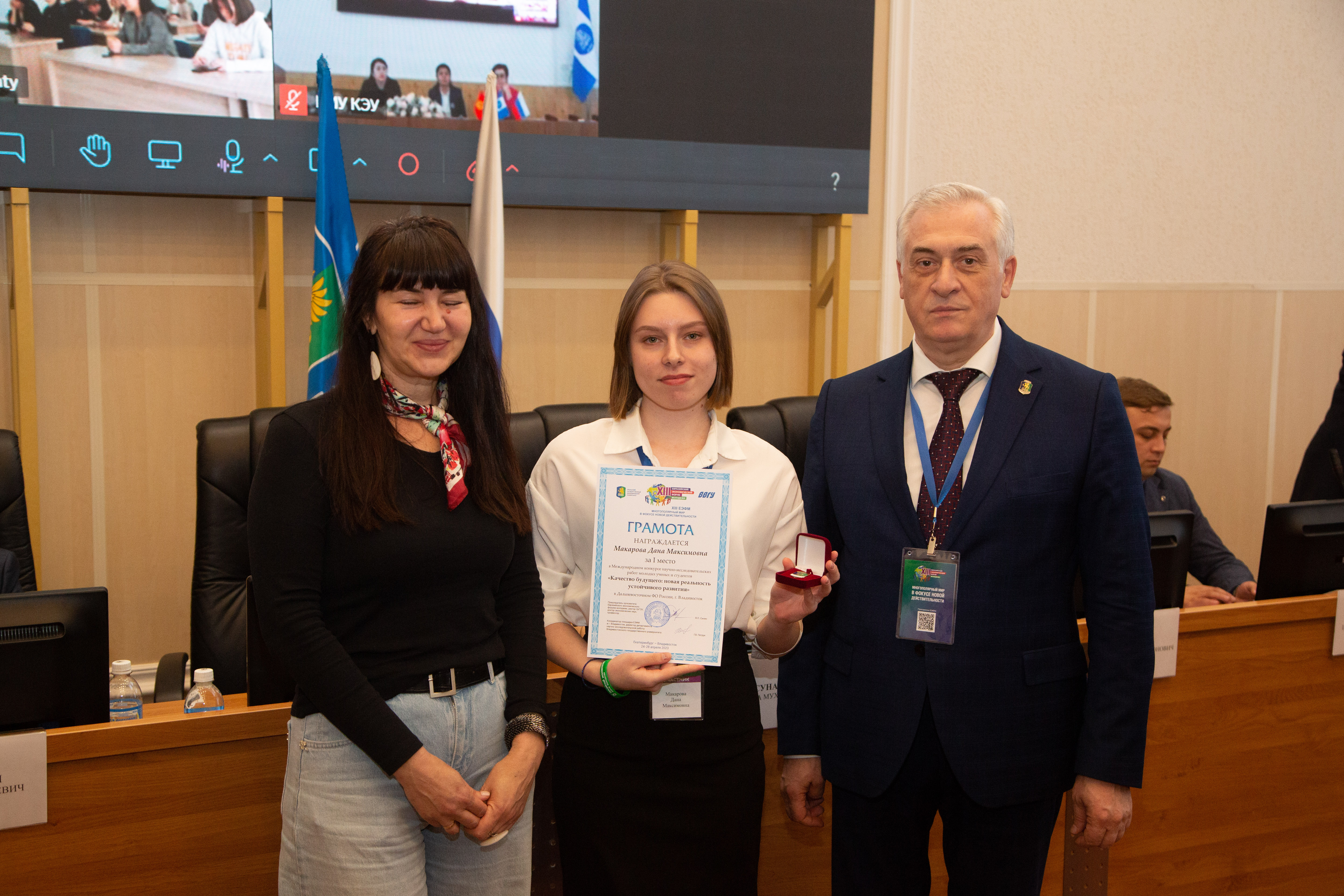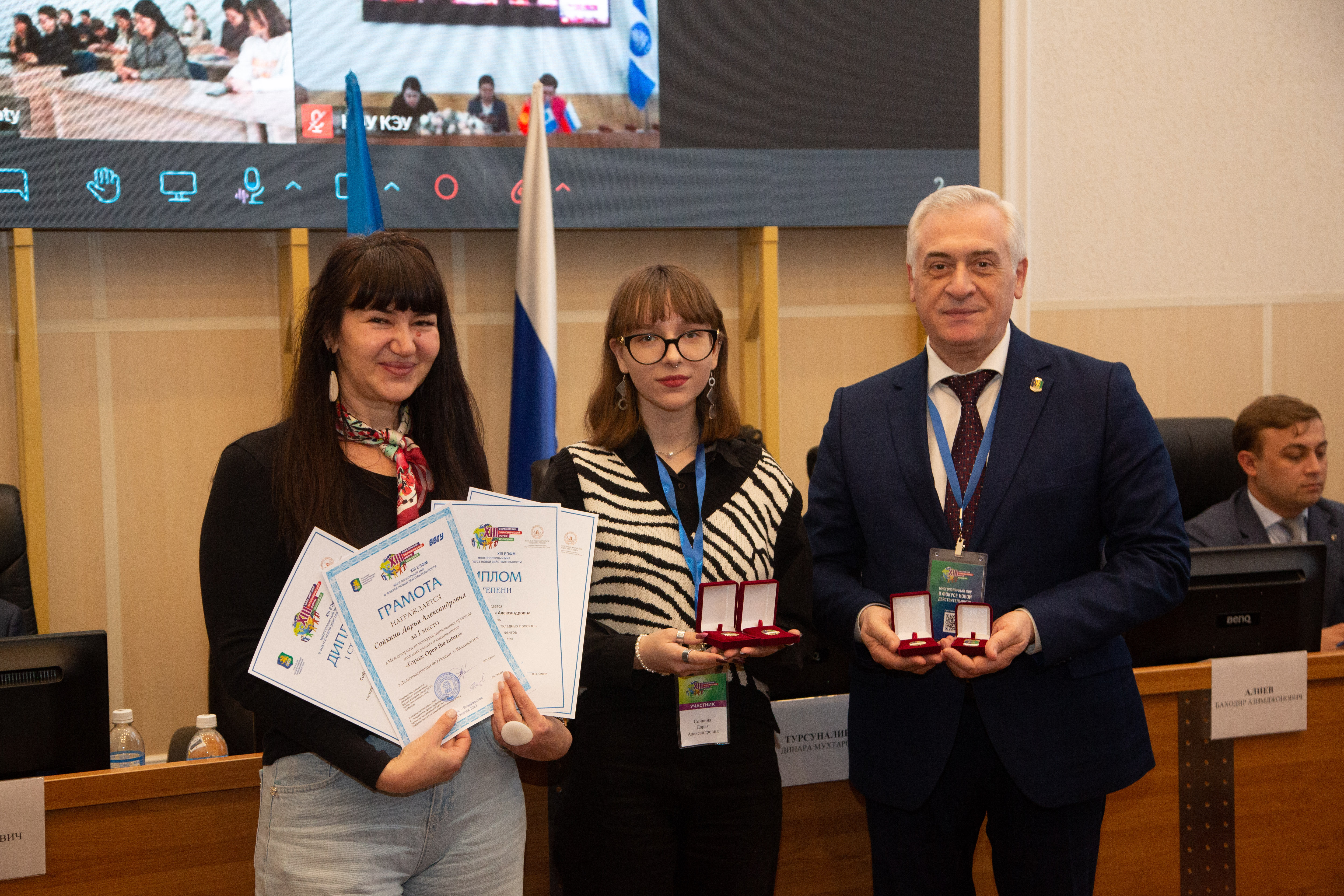 Грамоту за I место в региональном туре и дипломом за I место в Международном конкурсе прикладных проектов молодых ученых и специалистов «Город: Open the future» получила команда студентов Владивостокского государственного университета в составе Дарьи Кононовой, Дарьи Сойкиной и Анастасии Тюкавкиной.