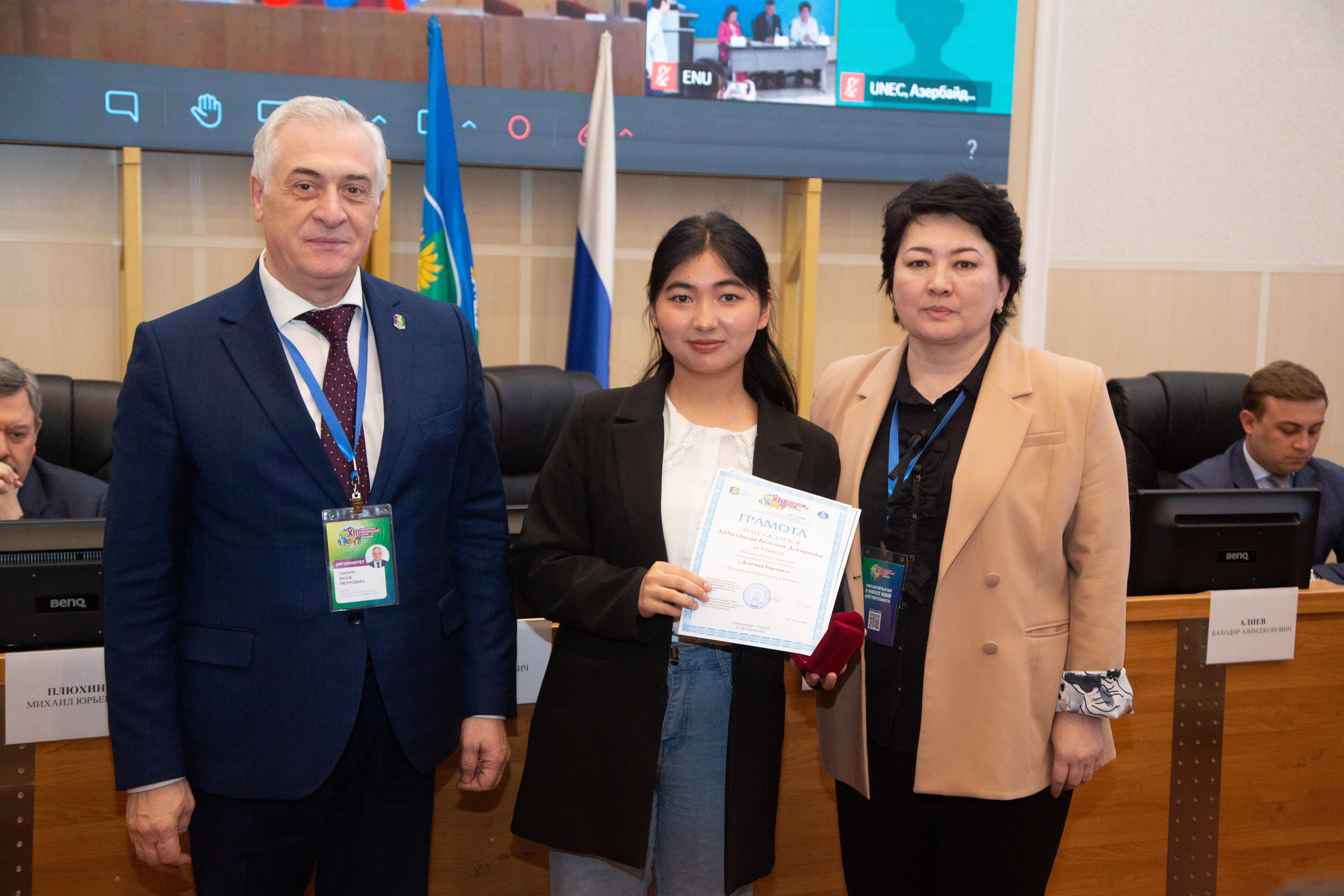 Среди участников из города Бишкека (Кыргызстан) грамотой за I место в национальном туре и дипломом за II место в Международном финале конкурса молодежных бизнес-проектов «Деловая Евразия» была награждена Бегимай Абдылдаева.